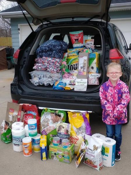 Hi, I'm Katelyn! I am 8-years-old and I live in Wisconsin. I love giving back! I think it is very important to help other people. I like to plan projects during the year that help others in my community and beyond. On my birthday, I do an extra special project that is different every year. This tradition started when I was 5 and started with donating supplies to the animal shelter. The next year, I collected stuffies for kids at the Children's Hospital of Wisconsin. Then, I made birthday cake kits! It makes me happy to be creative and to help others at the same time.